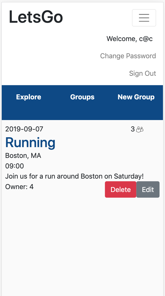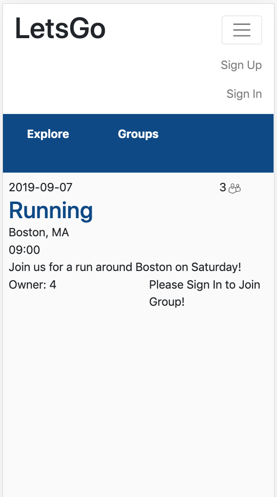 Below are the four new Group views, as well as the update Groups list component. First, when no user is signed in. Second, when a user is signed in, but not currently a member. Third, when a user is signed in and also a member of the current group. Fourth, when the current user is the owner of the group. Finally, the Groups list showing how many members are in each group!
