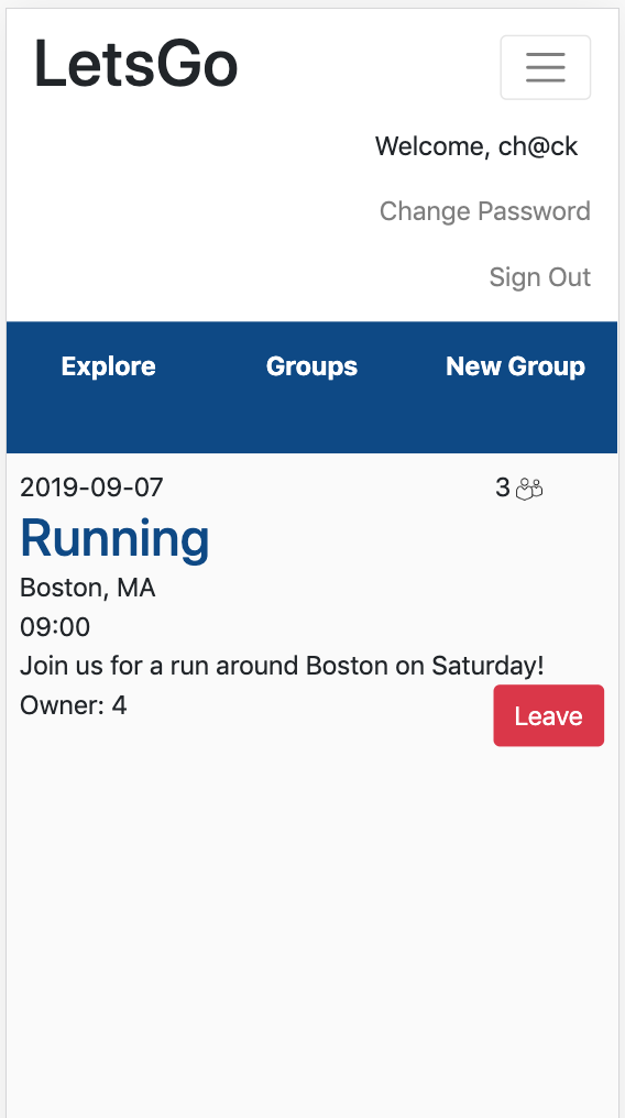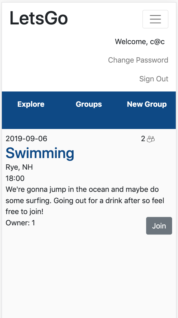Now I can successfully join or leave a group by creating or deleting a membership! One bug that I've noticed is that, if I do join a group, the Leave button show us, but clicking the Leave button gives me an error. This is because the new membership isn't found in the memberships array, since the component itself doesn't update. In order to the Leave button to work, I have to back to the Groups list, and then back into the specific group. I'm not completely sure how I'll fix this, so I leave a note and put it on the back burner for now. I'll work on a fix once I'm ready to re-factor the code later on.